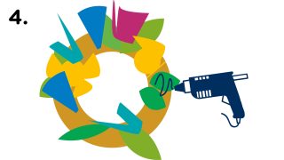 Fix the leaves onto the circle of card using glue. Add the flowers and fill the card.